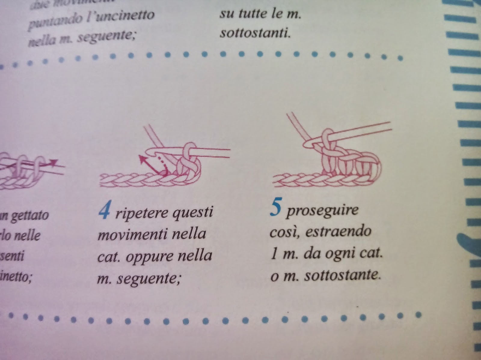 1) Con un colore a contrasto lavorare 1 M.B per ogni M sottostante, e 3 cat per riempire i vuoti tra un ventaglio e l'altro